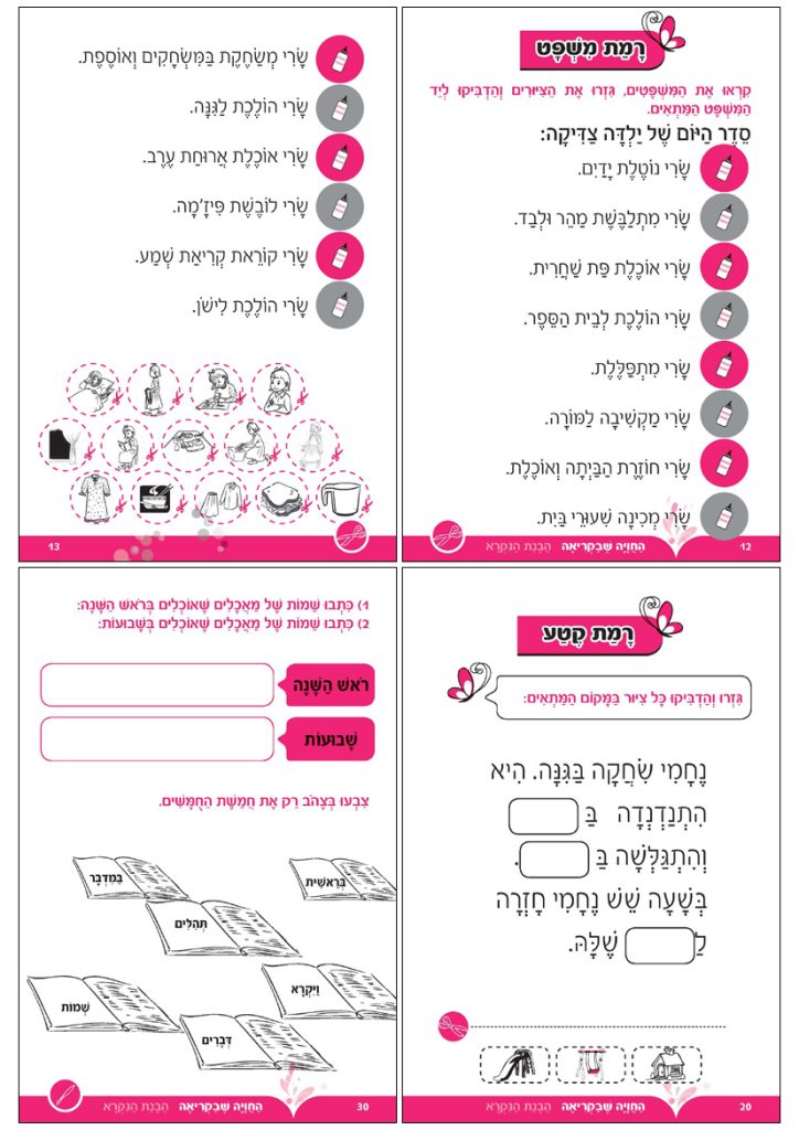 - Comprensión de lectura a nivel de oración: analizar oraciones (marcar correcto / incorrecto), corregir el orden de las palabras en la oración, completar las palabras faltantes en la oración.