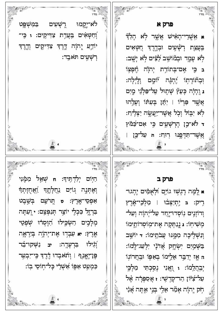 Se trata de un Tehilim propio para niños en etapa de entrenamiento de la lectura, ya que permite practicar leyendo los Perakim del Tehilim.