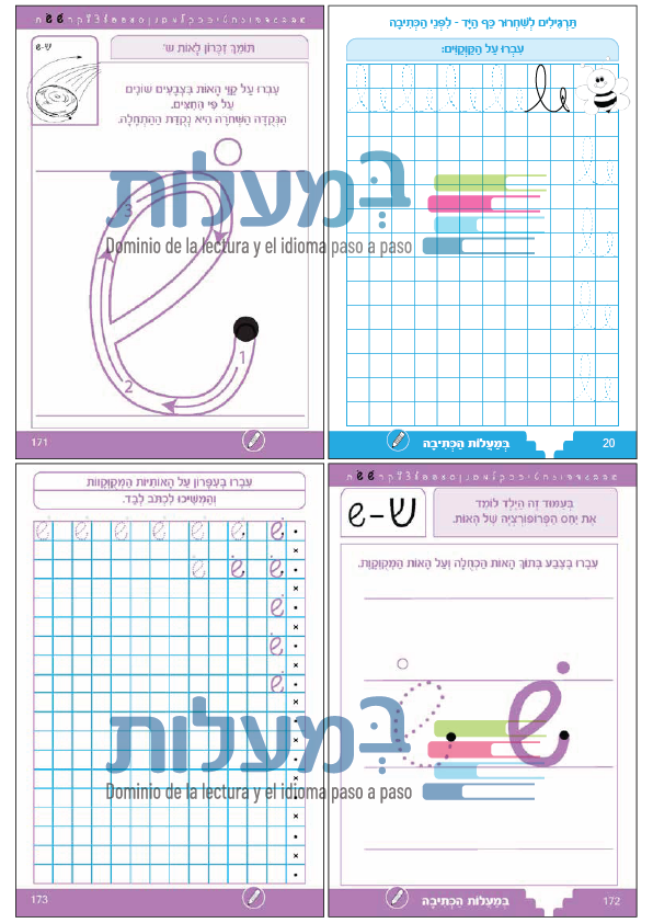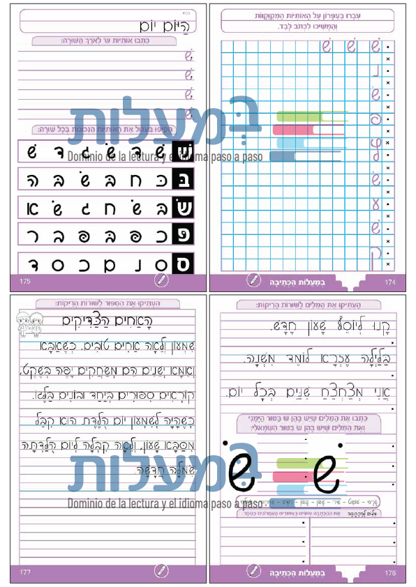 Para dar al niño una sensación de seguridad y gozo, cada nueva letra se adquiere gradualmente con los siguientes pasos (a continuación, se muestra un desglose de los números de página en la letra Alef, en el resto de las letras se dan una y otra vez en los mismos pasos):