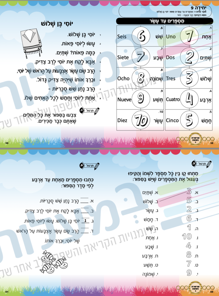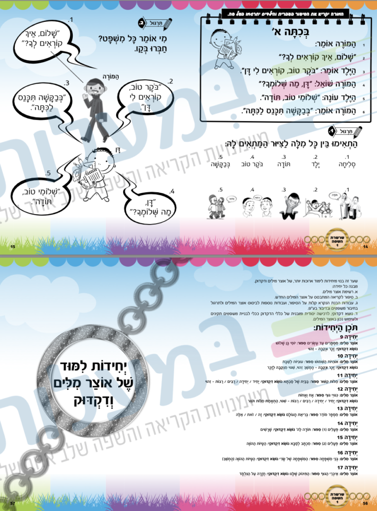 • Estructura del lenguaje (gramática): como una unidad separada, aparecen después de cada cuento actividades sobre varios temas de gramática que son la base del lenguaje: masculino-femenino, singular-plural, conjugaciones, Otiot Hashimush (מ,ש,ה, ו,כ,ל,ב), conjunciones y más. Con la ayuda de los ejercicios, el niño adquiere reglas gramaticales hebreas completas y estructuradas, para ayudarlo a construir oraciones correctas, usar el vocabulario que adquirió y comprender aún mejor los Pesukim de la Torá. Los ejercicios son graduales, de manera que cada tema se basa en los anteriores para elevar el nivel de aprendizaje.