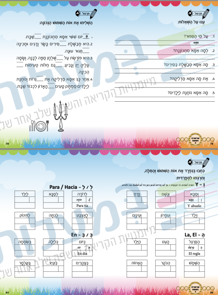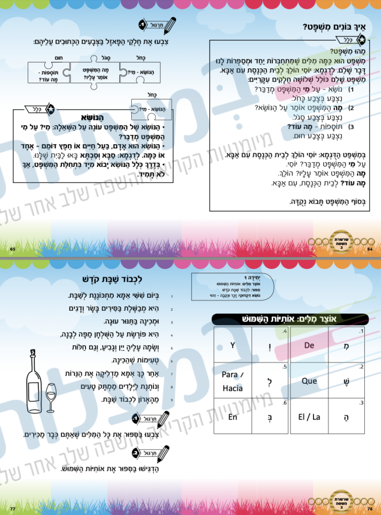 • Estructura del lenguaje (gramática): como una unidad separada, después de cada cuento, aparecen ejercicios y trabajos de varios temas de gramática que son fundamentales para el lenguaje: masculino-femenino, singular y plural, conjugaciones, Otiot Hashimush (מ,ש,ה, ו,כ,ל,ב), conjunciones y más (en un nivel superior al que se enseñó en el volumen anterior). Con la ayuda de los ejercicios, el niño adquiere una comprensión profunda y estructurada de las reglas gramaticales del idioma hebreo, para ayudarlo a construir oraciones correctas y a usar el vocabulario que adquirió, y comprender aún mejor los Pesukim de la Torá. Los ejercicios se desarrollan gradualmente, de modo que cada asignatura se basa en los temas anteriores y aumenta el nivel de aprendizaje.