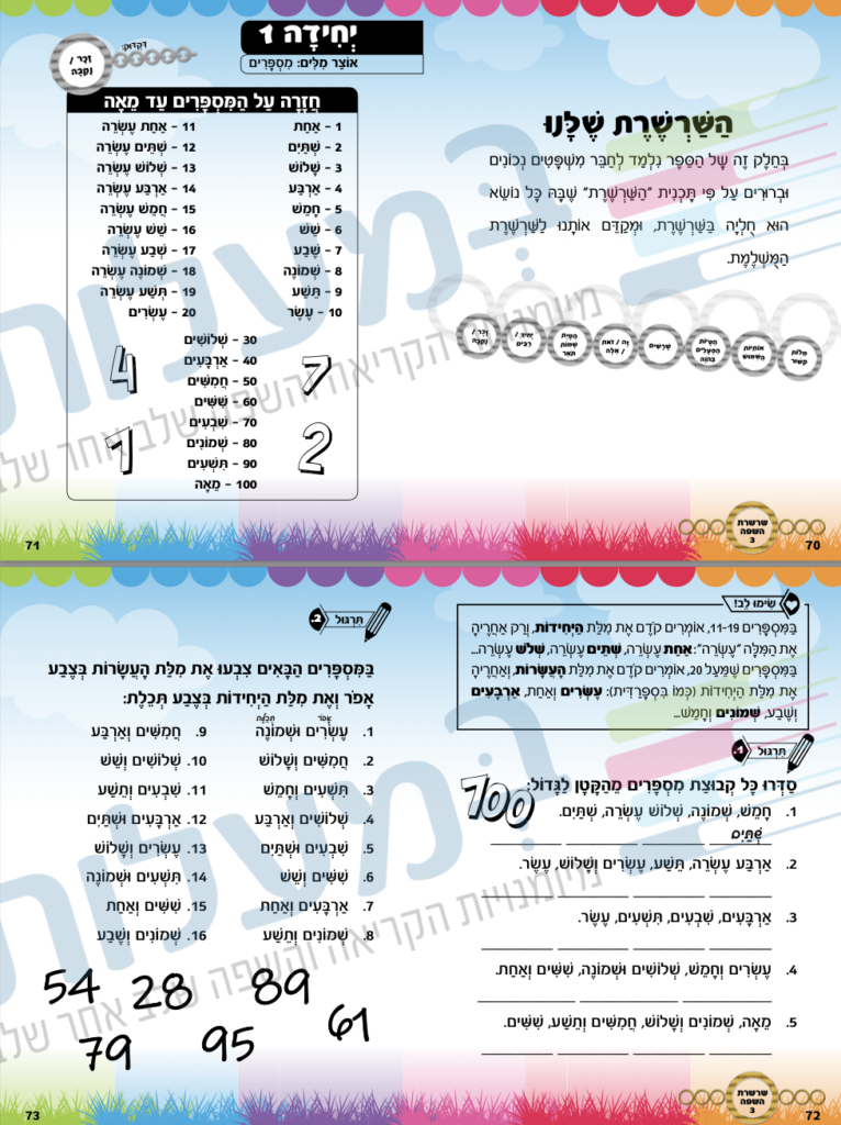• Comprensión de la lectura: En los volúmenes 3 y 4, la mayor parte del libro se enfoca en las áreas de lenguaje y gramática. Para un desarrollo más profundo de la comprensión lectora, se recomienda utilizar un libro adicional, especializado de texto “Navin Behanaá” o «Hajavaya Shebakriá» (para niñas) para el desarrollo de la comprensión de la lectura de una forma placentera, desde palabras individuales hasta párrafos y el seguimiento de instrucciones.
