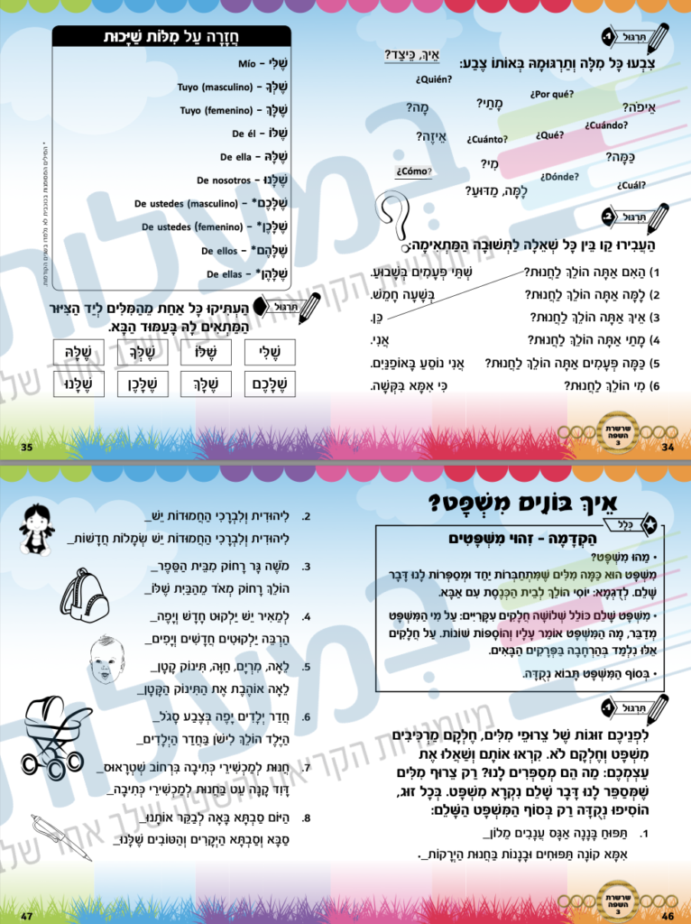 • Estructura del lenguaje (gramática): El libro se dedica principalmente a los diversos temas de gramática que son fundamentales para el lenguaje: masculino-femenino, singular-plural, adjetivos, conjugaciones y más (a un nivel superior al que se enseñó en volúmenes anteriores). Con la ayuda de los ejercicios, el niño continúa adquiriendo las reglas gramaticales del idioma hebreo completa y exhaustivamente, para ayudarlo a construir oraciones correctas y a usar el vocabulario que adquirió, y comprender aún mejor los Pesukim de la Torá. Los ejercicios se desarrollan gradualmente, de modo que cada uno se basa en los temas anteriores y aumenta el nivel de aprendizaje. Al terminar el libro de texto, se espera que el niño haya ampliado y aumentado el vocabulario que adquirió y que avance en la comprensión de la estructura del lenguaje y las reglas gramaticales.