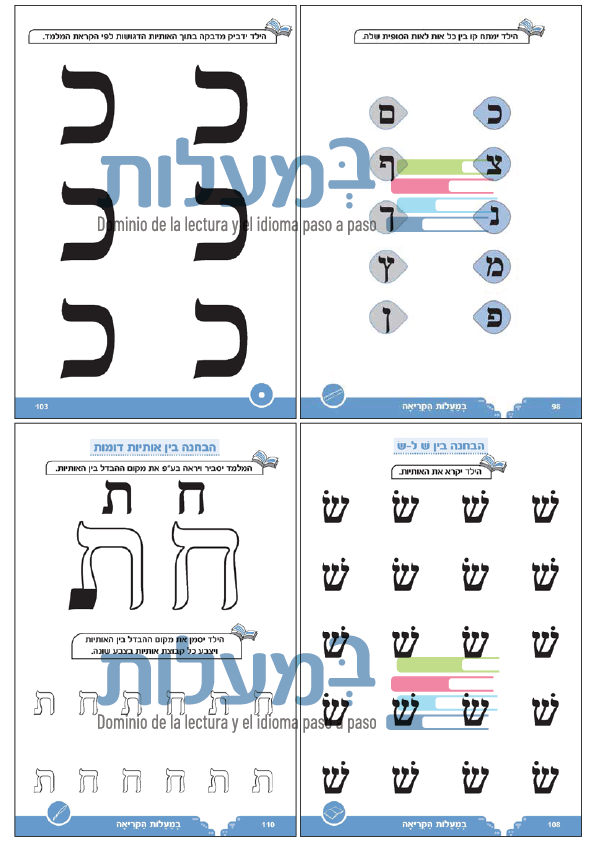 6) Distinguir entre letras gráficamente similares (Jet/Tav – He/Jet, etc.) Estos ejercicios no siempre son necesarios en la etapa de la enseñanza de las letras en serie; están disponibles para su uso, según sea necesario en el caso de que los niños tiendan a confundir las letras similares (págs. 110-119).