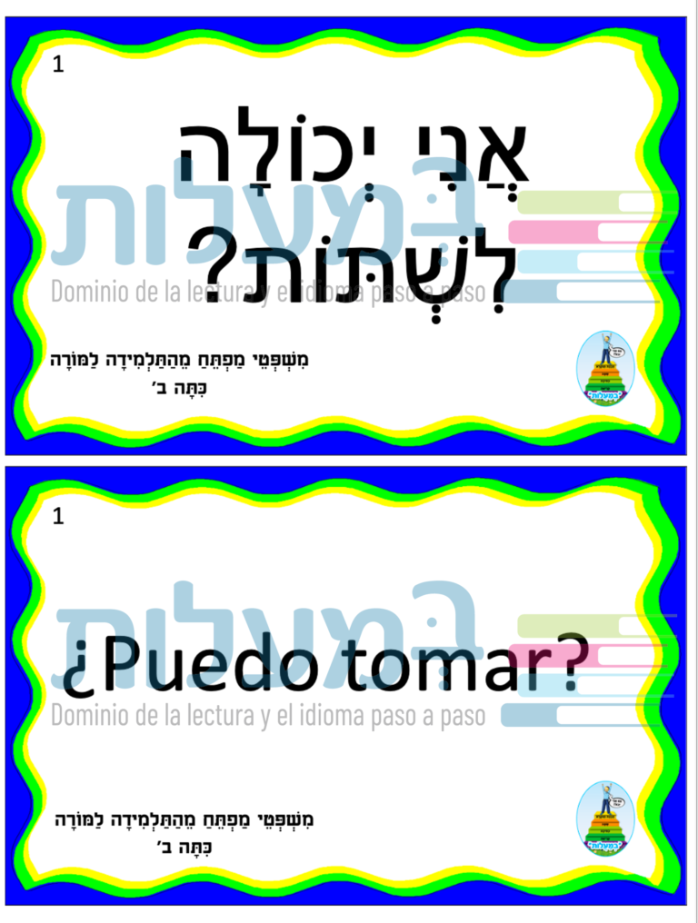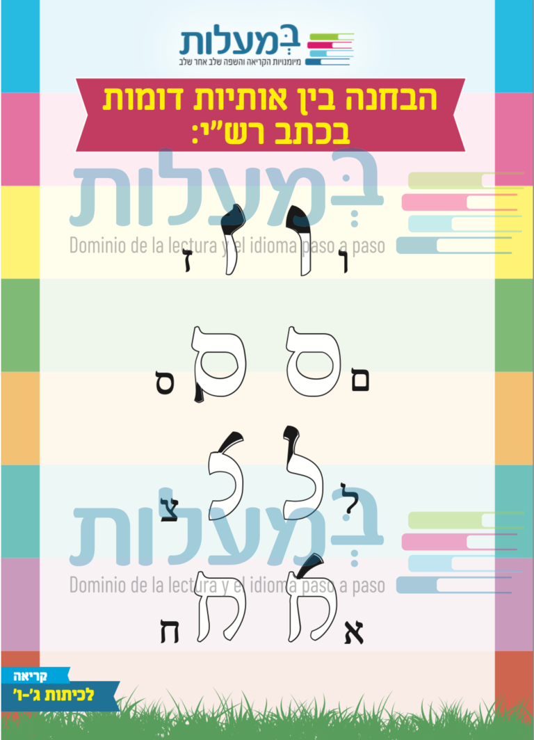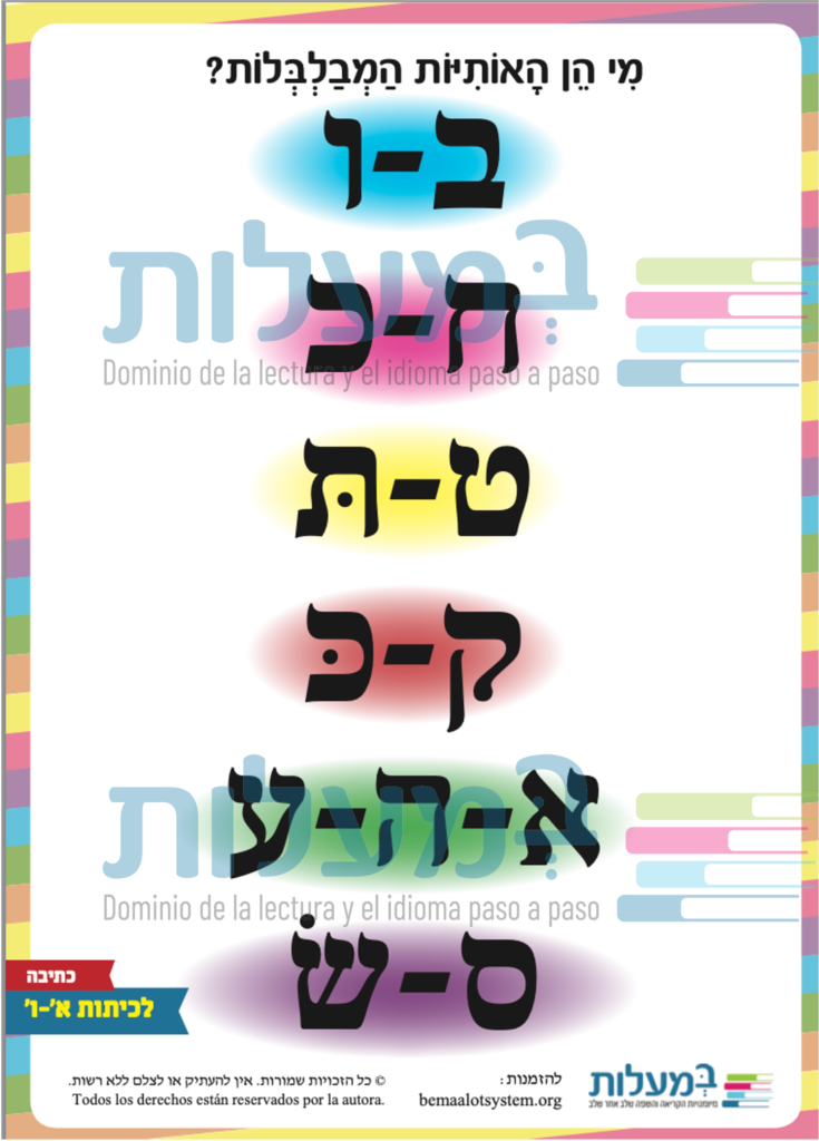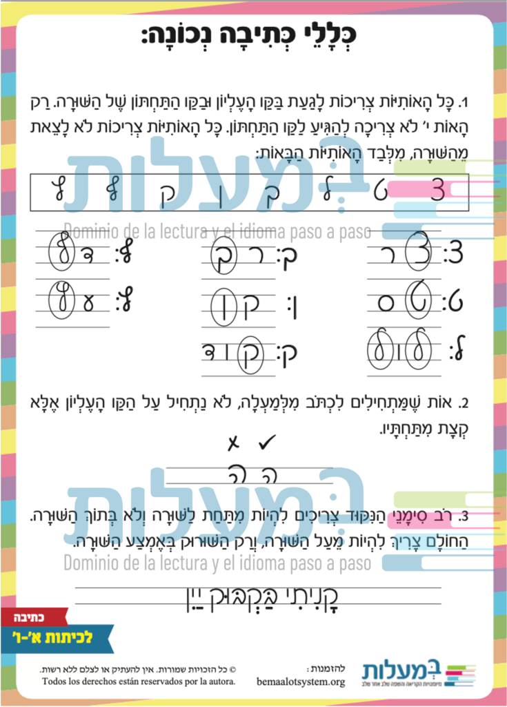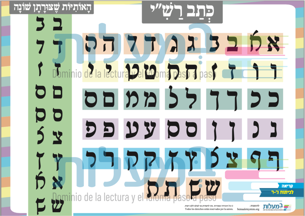 Lectura Tarjetas para repasar letras de Rashi Cartel para enseñar lectura sin Nekudot Cartel para conocer las letras de Rashi Cartel para enseñar letras parecidas de Rashi Cartel de los conceptos de lectura Escritura Reglas para aprender a copiar correctamente sin faltas de ortografía Reglas para aprender a escribir ordenadamente en el cuaderno Cartel de apoyo para aprender a escribir las letras Reglas para aprender a escribir correctamente en el cuaderno Cartel para enseñar la base de la ortografia Cartel de escritura correcta de las letras Idioma, comprensión de la lectura y gramática Cartel para aprender las raíces de la palabra Cartel para enseñar los verbos en presente Cartel para enseñar los verbos en futuro Cartel para enseñar masculino y femenino Cartel para enseñar los verbos en pasado Tarjetas para repaso del Otzar Milim en la Kitá Vídeo para repasar el vocabulario